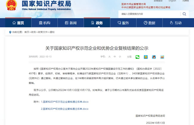 近日,國家知識產(chǎn)權(quán)局公布2022年度國家知識產(chǎn)權(quán)示范企業(yè)復核通過名單。