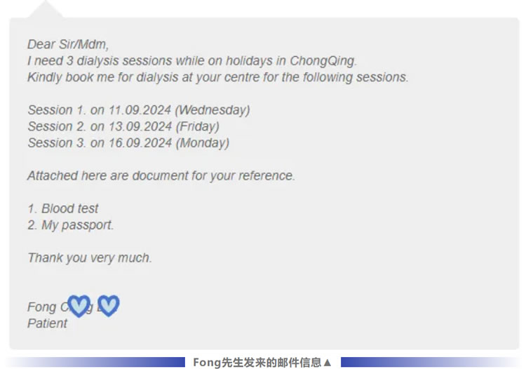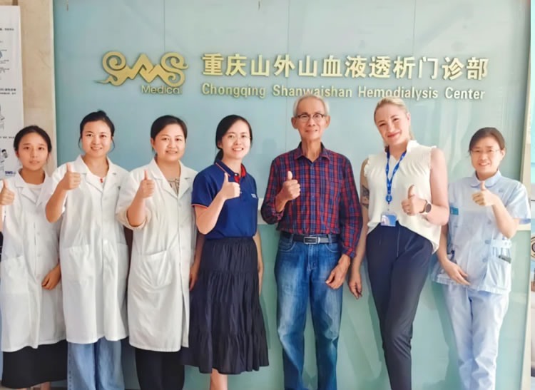 據了解,F(xiàn)ong先生今年69歲,接受透析治療已有10年。作為一名旅游愛好者,他本次不遠千里前來中國,只為領略山城重慶的獨特魅力,但如何定期進行透析治療卻成了難題。通過網上搜索以及海外腎友圈分享的口碑了解到山外山公司及其血液透析中心后,立馬聯(lián)系了山外山國際部的工作人員,最終確定在重慶山外山血液透析門診部開展一周3次的透析治療。