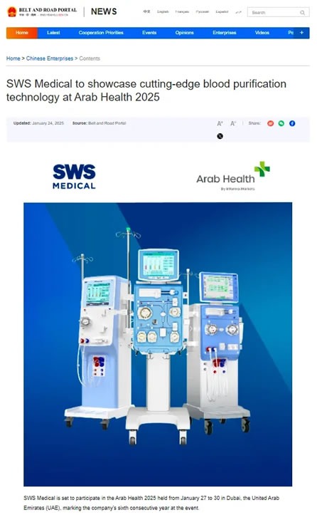 2025年1月24日,中國(guó)一帶一路網(wǎng)刊文《SWS Medical to showcase cutting-edge blood purification technology at Arab Health 2025》,聚焦重慶山外山血液凈化技術(shù)股份有限公司(山外山,科創(chuàng)板股票代碼:688410)將在2025年阿拉伯國(guó)際醫(yī)療設(shè)備展上展示前沿血液凈化解決方案。