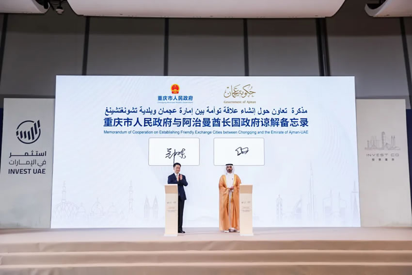 2025年5月23日,以“共享愿景·共享未來”為主題的“中國(重慶)—阿聯(lián)酋經(jīng)貿(mào)投資推介會(huì)”在渝舉行。阿治曼酋長國政府與重慶市政府在會(huì)上正式簽署友好城市合作諒解備忘錄,阿治曼酋長國王儲(chǔ)兼執(zhí)行委員會(huì)主席謝赫阿馬爾·努艾米、阿聯(lián)酋駐華大使侯賽因·哈馬迪、重慶市副市長鄭向東等數(shù)百位政商高層出席會(huì)議。